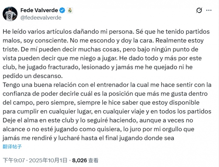 10月01日讯 巴尔韦德发布社媒,恢复此前媒体报谈称我方拒却出战的说法,他暗意我方与训诲关系很好,愿为皇马付出一切。
