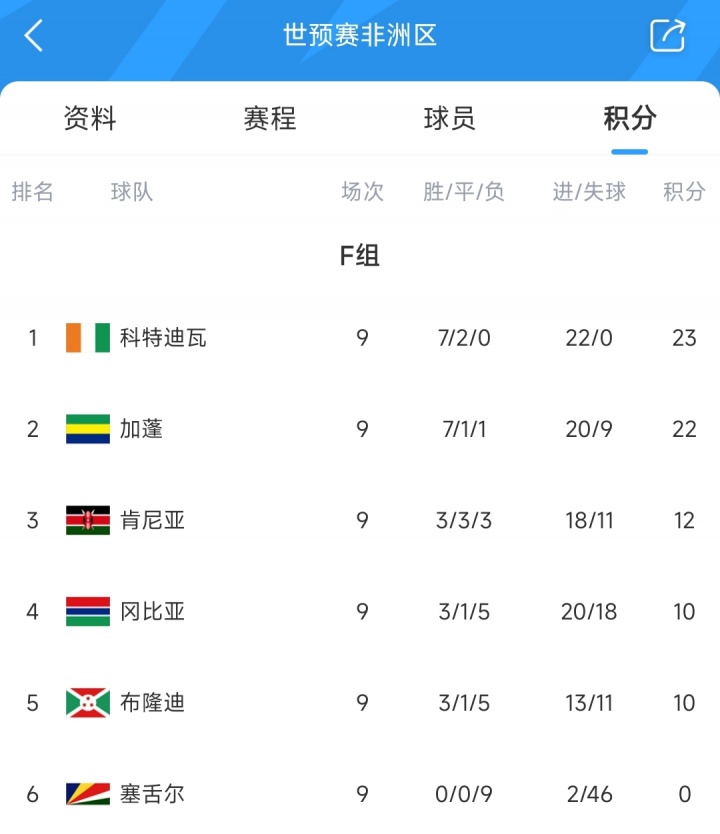 至此,在预选赛还剩1轮的情况下,科特迪瓦向上第二加蓬1分+11个净胜球,主动权仍捏在手中。此外,除了9个小组第一纵贯宇宙杯,非洲区9个小组中最佳的4个第二将角逐附加赛限额。