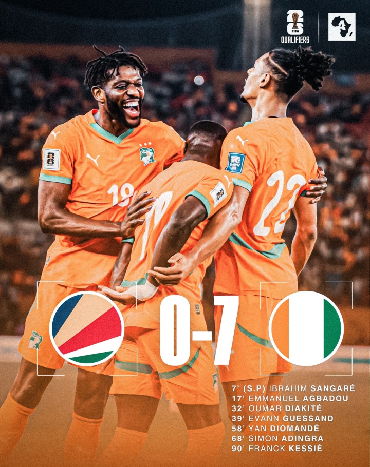 10月10日讯 宇宙杯非洲区预选赛,科特迪瓦7-0大捷塞舌尔,接续领跑F组。