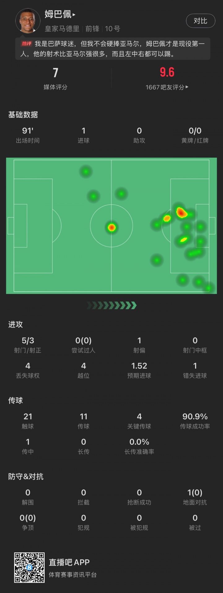 10月27日讯 皇马2-1巴萨,赶走国度德比四连败。姆巴佩破门+失点+两球被吹,第90分钟被换下。