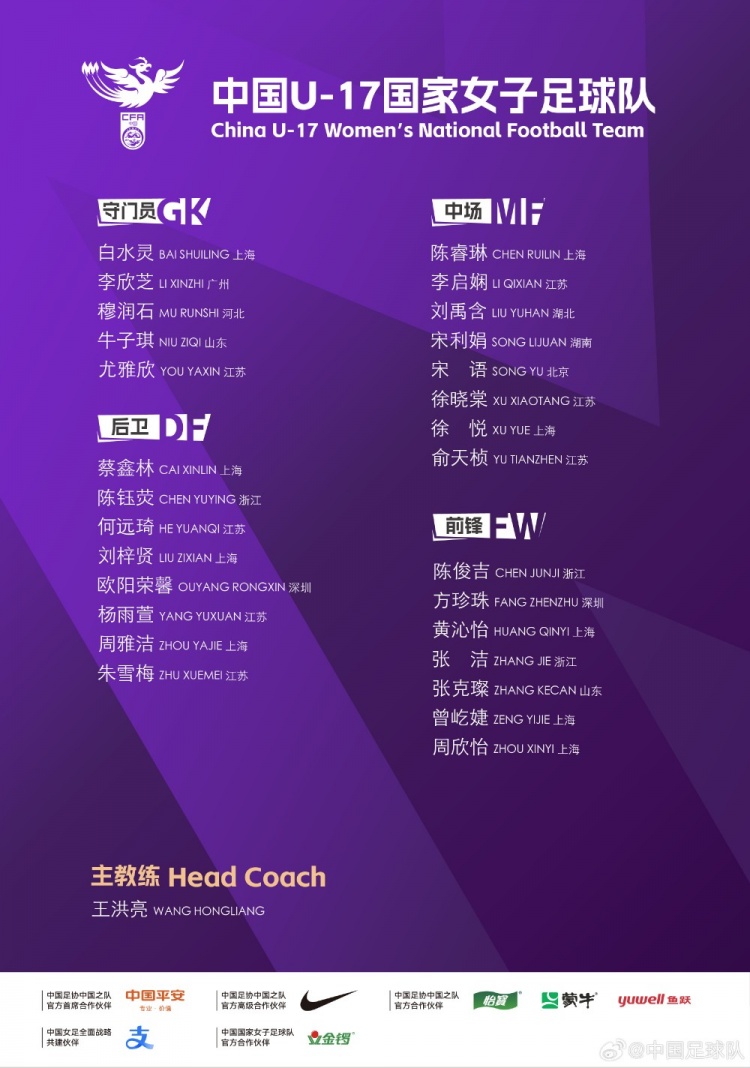 9月3日讯 中国足协官方公布了U17国度女子足球队2025年第五期集训名单,王洪亮出任主教师,朱挺、姜宁为检修员,共28名球员入选