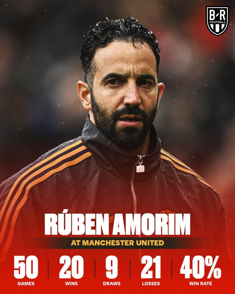 好意思媒B/R Football晒出海报,海报中枚举出阿莫林握教曼联以来的战绩:50场比赛,20胜9平21负,胜率40%。