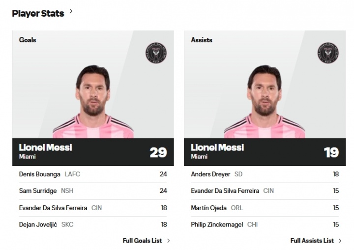 2025成例赛,梅西28场得益29球19助,现在双双霸榜好意思职联成例赛的弓手榜和助攻榜。