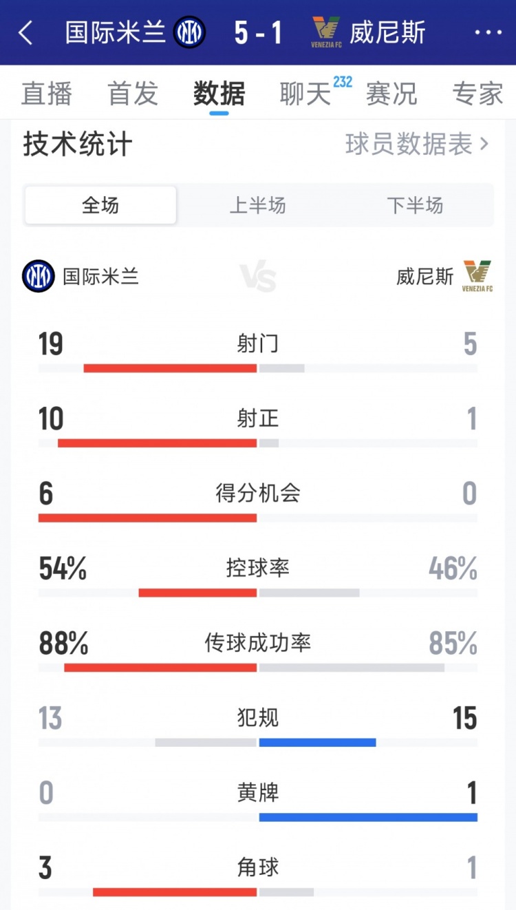 12月4日讯 在本轮意大利杯,国米5-1大捷威尼斯,以下为两边全场数据对比:
