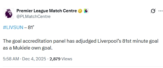 英超官方写谈:“进球认证小组判定利物浦第81分钟的进球为穆基勒的乌龙球。”