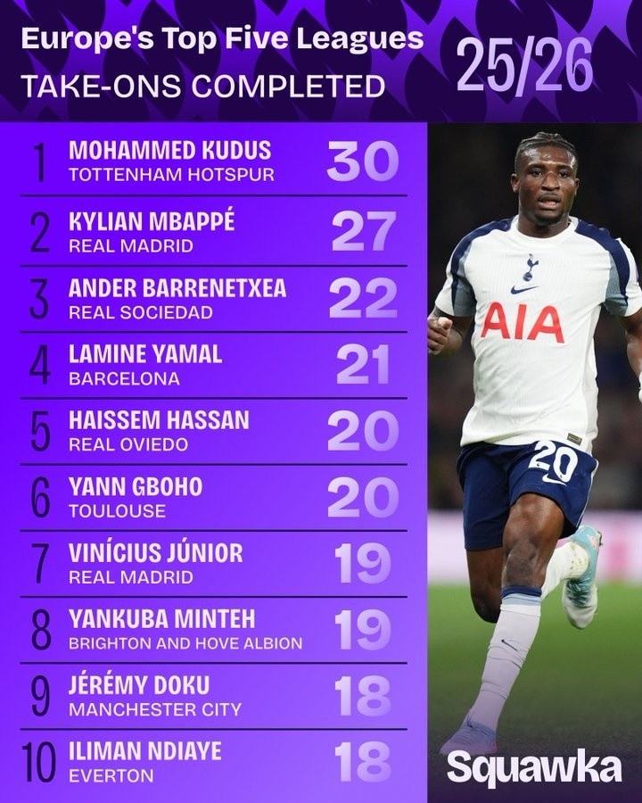 欧洲五大联赛 25/26 赛季成效过东谈主榜