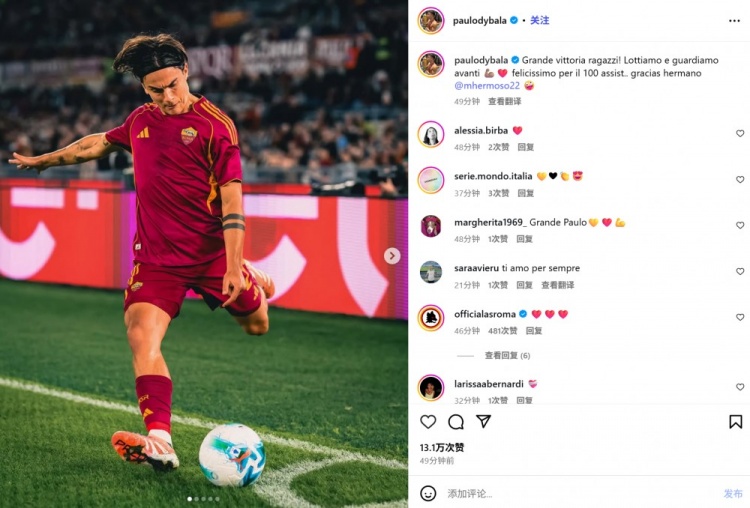 迪巴拉也在赛后通过社媒晒出我方的比赛照,并操心说念:“太棒了,伴计们!让咱们不时贫窭前进💪🏽❤️ 相配闲逸拿到第100次助攻……谢谢兄弟@埃尔莫索 🤪”
