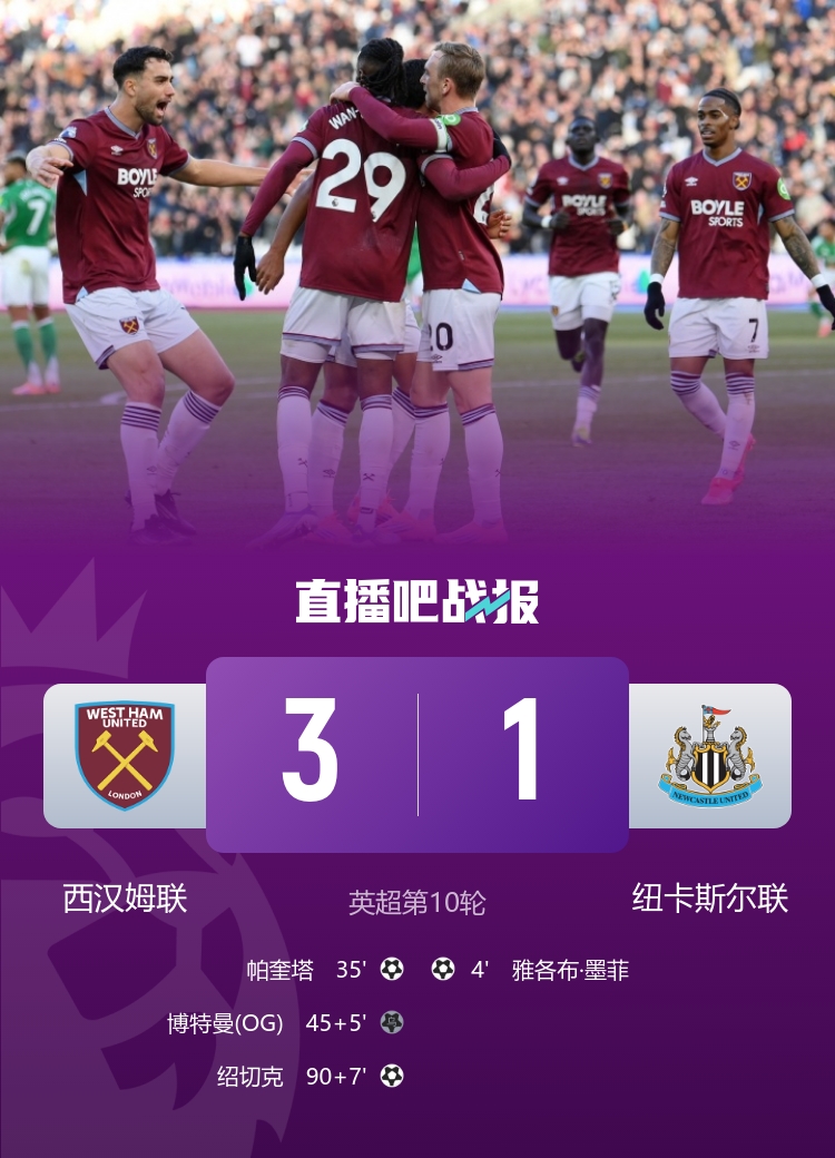 英超-西汉姆联3-1纽卡端正6轮不堪 帕奎塔寰球波万比萨卡造乌龙