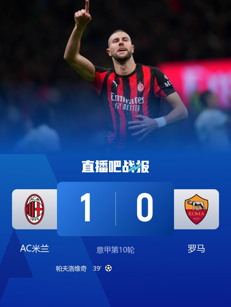 本轮意甲焦点战,米兰1-0打败罗马,莱奥助攻帕夫洛维奇打入全场惟一进球。