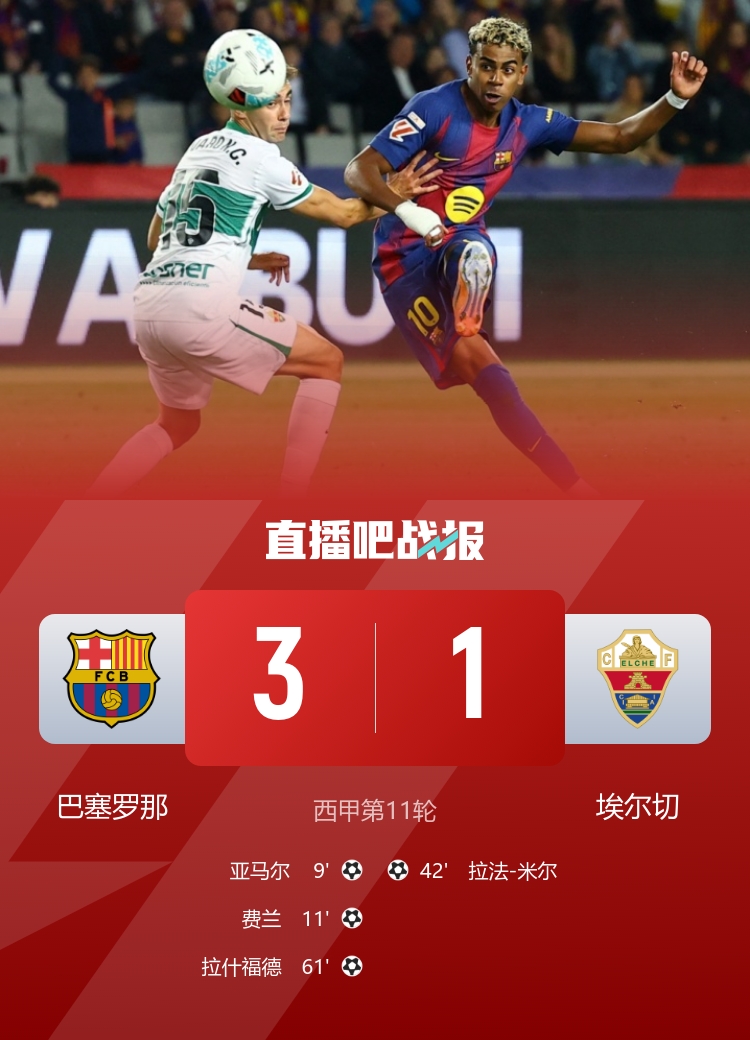 本轮西甲,巴萨3-1打败埃尔切,拉什福德、费兰和亚马尔各入一球。
