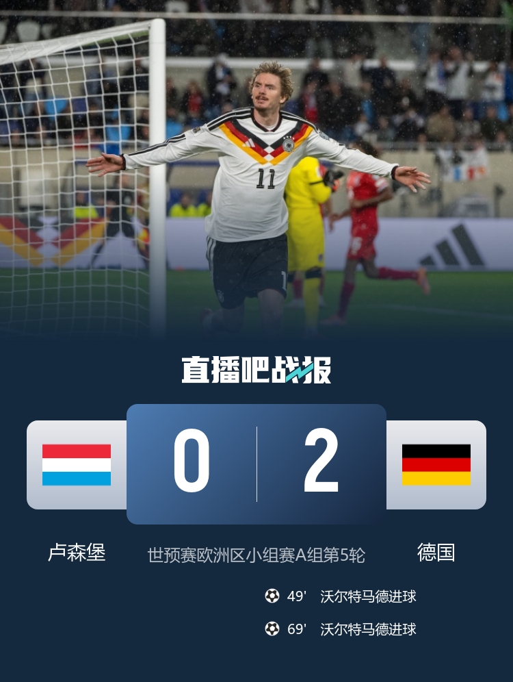 世初赛A组第5轮,德国客场2-0卢森堡,沃尔特马德双响。德国末轮战平斯洛伐克就能头名出线。