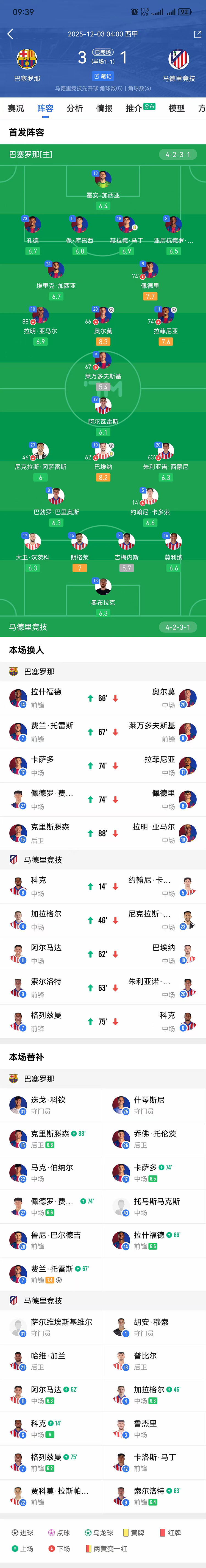 北京技巧12月3日凌晨4:00,2025-26赛季西甲联赛第19轮,巴塞罗那镇守诺坎普球场迎战马德里竞技。上半场巴埃纳单刀球破门,拉菲尼亚过掉奥布拉克打佛门扳平,奥尔莫造点,莱万打飞,两队暂1-1战平;下半场奥尔莫破门后伤退,费兰补时锁定胜局,最终巴萨3-1马竞,先赛4分领跑。 【比赛关节事件】 第19分钟,莫利纳送出长传,巴埃纳前插取得单刀球契机,突入禁区一脚巧射攻破霍安·加西亚的十指关,主裁判鸣哨流露越位,VAR介入,最终主裁判阐述进球灵验,马竞1-0巴萨。 第26分钟,佩德里送出直塞,拉菲尼亚前插取得单刀球契机,过掉奥布拉克后打佛门到手,巴萨1-1马竞。 第35分钟,奥尔莫突入禁区被巴里奥斯绊倒,主裁判鸣哨流露是点球。 第36分钟,莱万主罚点球,这球径直奉上看台。 第65分钟,奥尔莫与莱万打出合作,接到后者直塞作念球后禁区内左脚低射到手,这球打进后奥尔莫还受伤了,巴萨2-1马竞。 第90+6分钟,拉什福德左路直塞,巴尔德送出传中,费兰中路无东说念主盯防,停球后趁势攻门到手,巴萨3-1马竞。 【比赛焦点一忽儿】 第2分钟,巴萨反击,奥布拉克出击化解了拉菲尼亚可能的单刀球契机。 第9分钟,拉菲尼亚外围尝试一脚爆射,稍许跳动横梁。 第14分钟,卡尔多索因伤无法坚抓比赛,被科克换下,此前他在一次挣扎中受伤。 第15分钟,亚马尔右路开脱细心,随后尝试一脚兜射,打飞了。 第31分钟,库巴西头球突围简直让马竞取得单刀球契机,霍安·加西亚出击突围。 第38分钟,亚马尔右路送出传中,莱万头球攻门,奥布拉克响应飞速将球扑出。 第41分钟,巴埃纳撞翻库巴西,吃到黄牌。 上半场伤停补时4分钟,第45+2分钟,马丁铲翻朱利亚诺·西蒙尼,吃到黄牌。 半场完了,巴萨暂1-1马竞。 易边再战,第52分钟,禁区内阿尔瓦雷斯小角度挑射,被霍安·加西亚充公。 第53分钟,亚马尔右路内切,随后送出斜传,拉菲尼亚无东说念主盯防低射远角,偏出了远门柱。 第54分钟,马竞组织攻势,禁区内朱利亚诺·西蒙尼接到队友作念球,跟进射门偏得有些多。 第58分钟,拉菲尼亚横传门前,莱万抢点稍慢错失良机。 第69分钟,亚马尔接到队友斜传,突入禁区兜射远角打偏了。 第79分钟,阿尔马达接到队友直塞,单刀球契机突入禁区莫得径直射门,集结开脱后将细心球员晃得东说念主仰马翻,不外临了的射门打偏了。 下半场伤停补时6分钟,第90+3分钟,拉什福德禁区内开脱后低射近角,被奥布拉克挡出。 全场比赛完了,最终巴萨3-1马竞。 【两边首发以及换东说念主信息】 巴塞罗那首发:13-霍安·加西亚、3-巴尔德、5-库巴西、18-赫拉德·马丁、23-孔德、24-埃里克·加西亚、8-佩德里(73'' 27-德罗·费尔南德斯)、9-莱万(67'' 14-拉什福德)、10-亚马尔(88'' 15-克里斯滕森)、11-拉菲尼亚(73'' 17-卡萨多)、20-奥尔莫(67'' 7-费兰) 巴塞罗那替补:25-什琴斯尼、31-迭戈·科肯、26-托伦茨、22-伯纳尔、28-巴德吉、43-托米·马奎斯 马德里竞技首发:13-奥布拉克、16-莫利纳、2-吉梅内斯、15-朗格莱、17-汉茨科、5-卡尔多索(14'' 6-科克(75'' 7-格列兹曼))、8-巴里奥斯、10-巴埃纳(62'' 11-阿尔马达)、20-朱利亚诺·西蒙尼(62'' 9-瑟尔洛特)、23-尼古拉斯·冈萨雷斯(46'' 4-加拉格尔)、19-阿尔瓦雷斯 马德里竞技替补:1-穆索、31-埃斯基韦尔、3-鲁杰里、18-普比尔、21-加兰、12-卡洛斯-马丁、22-拉斯帕多里