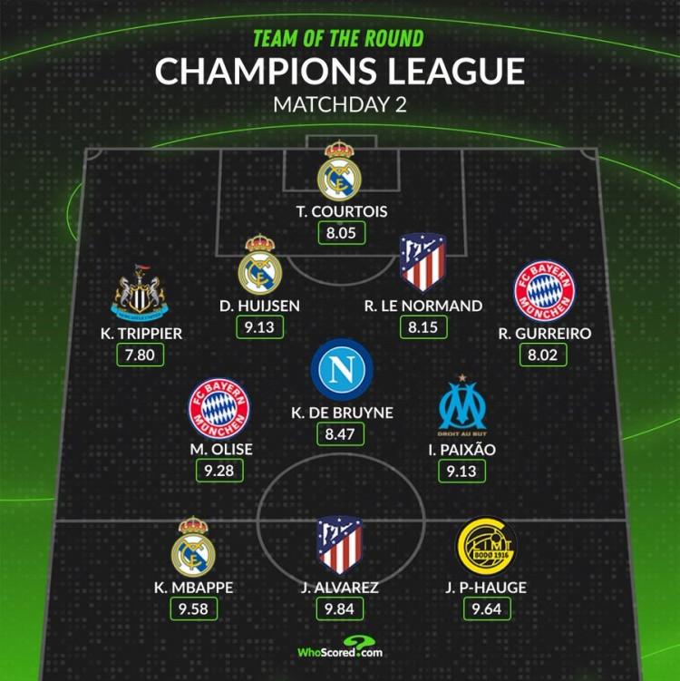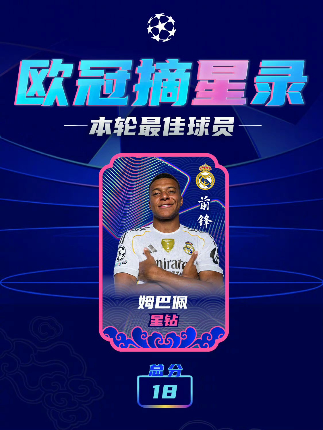 ②欧冠官方本轮最好球员:10-姆巴佩(皇家马德里)