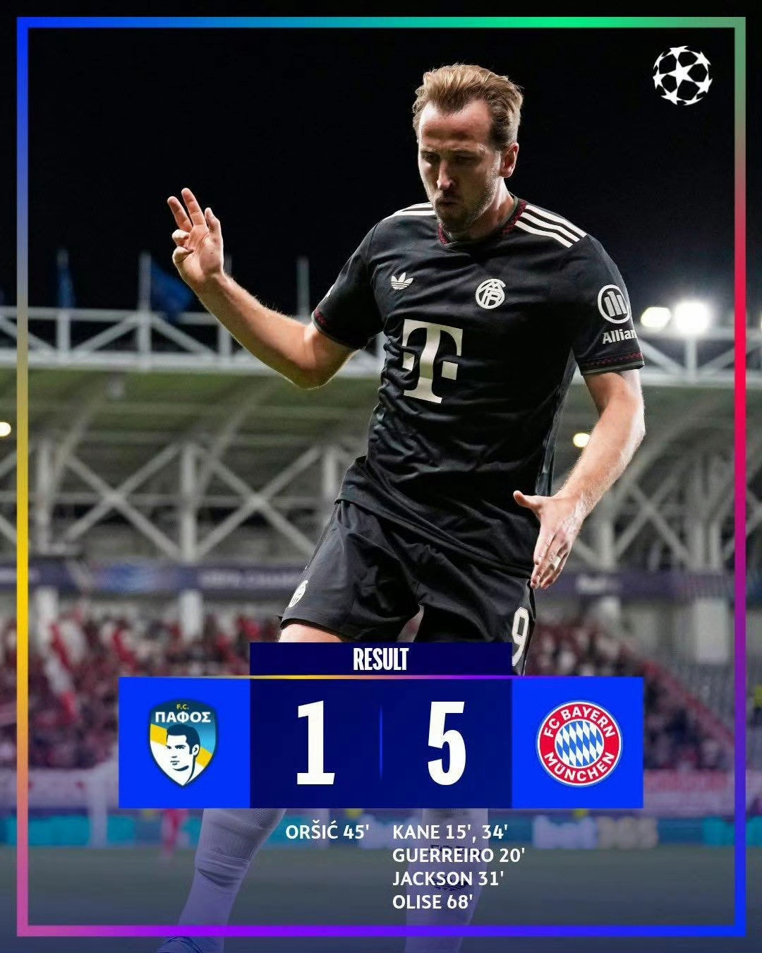拜仁、马赛和国米齐在短技术内相接进球提前闭幕悬念。拜仁慕尼黑在20分钟内就打花了塞浦路斯新军帕福斯,从比赛第15分钟至第34分钟,哈里·凯恩完成梅开二度,格雷罗和新援雅克松先后进球,比赛悬念早早闭幕,尔后奥尔西奇的寰球波匡助帕福斯打进队史欧冠首球但无法相通积分,奥利塞鄙人半场的进球匡助拜仁惜墨若金。马赛相通只用了20分钟就击溃了荷兰权门阿贾克斯,从比赛第6分钟至第26分钟,派尚的梅开二度和格林伍德的进球让马赛奠定三球上风,奥巴梅杨鄙人半场的进球匡助马赛惜墨若金。海外米兰则在5分钟内奠定了胜局,捷克冠军布拉格斯拉维亚门将斯塔涅克的深广造作让球队崩溃,劳塔罗和邓弗里斯在短技术内相接进球,而鄙人半场劳塔罗再下一城匡助蓝黑军团锁定胜局。
