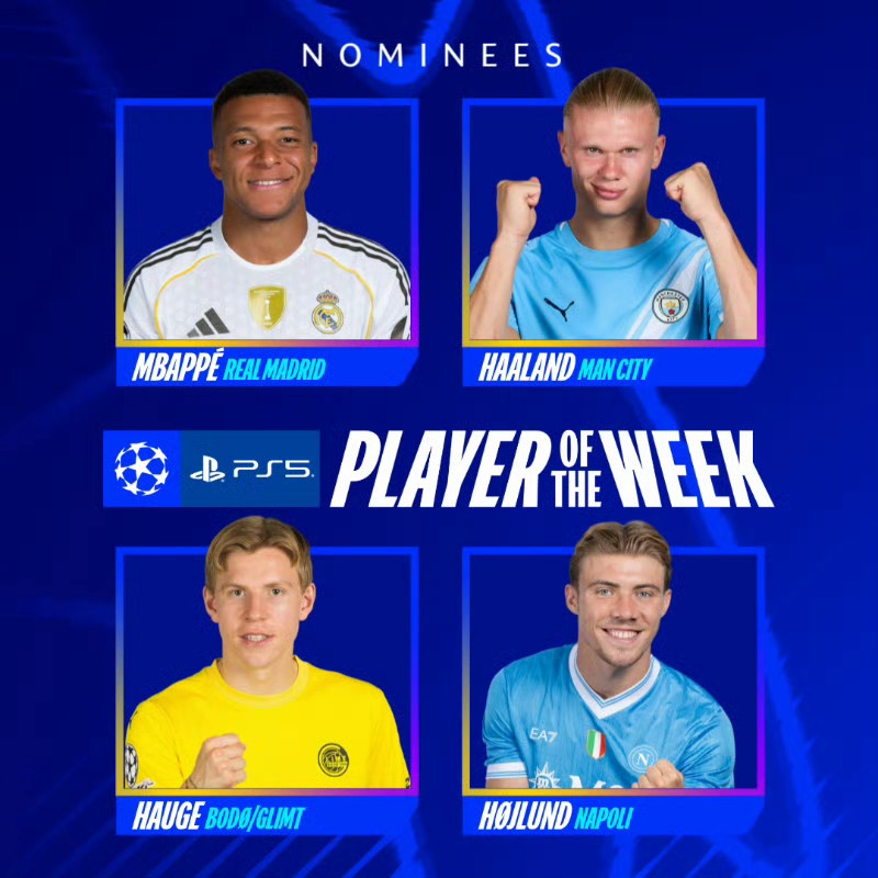 姆巴佩凭借出色推崇当选欧冠官方评比出的本轮比赛最好球员,其他候选东谈主包括哈兰德、海于格以及霍伊伦。