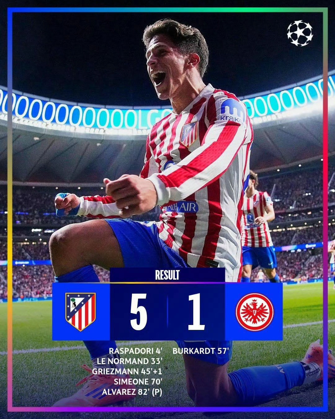 在首轮比赛截止后,排行积分榜首的不是那些老牌权门或是冠军之师,而是德甲球队法兰克福,天然和首轮的敌手比拟,次轮他们需要前去西班牙挑战马德里竞技,这并不是一个级别的敌手。马德里竞技在上场比赛中5-2击溃了皇家马德里,但欧冠首轮的失利让他们需要在接下来的欧冠比赛中争夺更多积分。开场后床单军团就拉满了强度,拉斯帕多里在第4分钟就取得了进球,尔后诚然法兰克福占据了控球上风,但获取更多契机的明显照旧马竞。第33分钟,勒诺尔芒打进了我方的欧冠首球,而上半场截止前格列兹曼打进了我方在马竞的第200粒进球,比赛悬念在上半场就闭幕了。下半场比赛中马竞主动减轻,法兰克福凭借伯卡特的进球扳回一城,但尔后马竞凭借小西蒙尼和阿尔瓦雷斯的进球无间扩猛提升,最终法兰克福在首轮5-1赢球的情况下次轮输了个1-5,而马竞在近2场比赛中打进了10球。