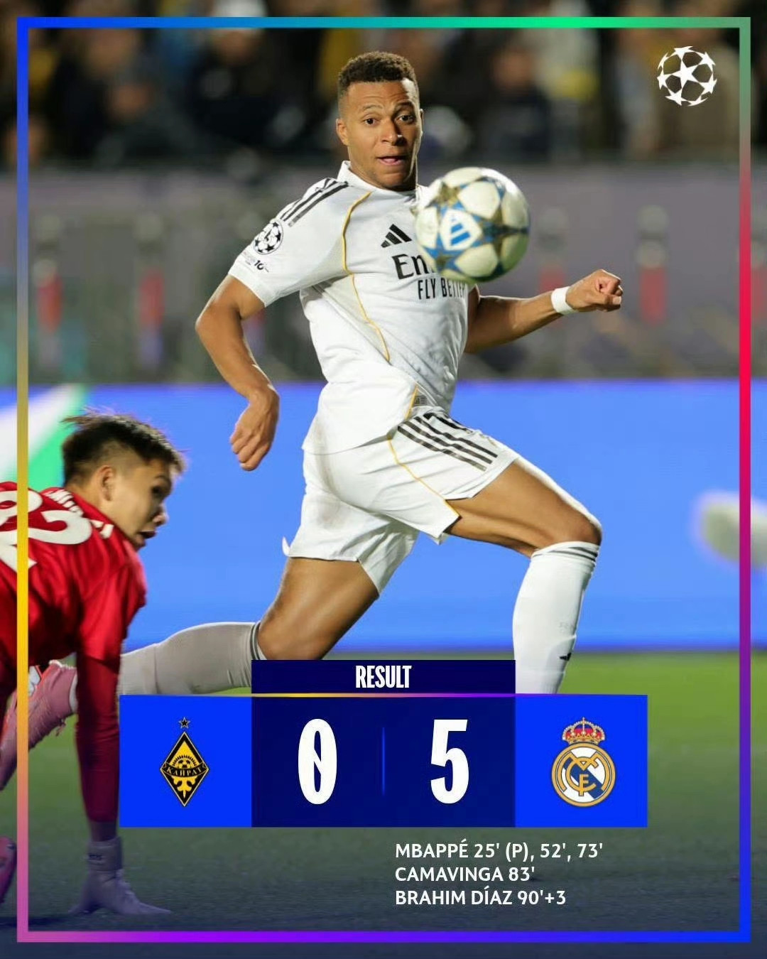 在本轮欧冠,皇马5-0大胜阿拉木图凯拉特,姆巴佩献艺帽子戏法。