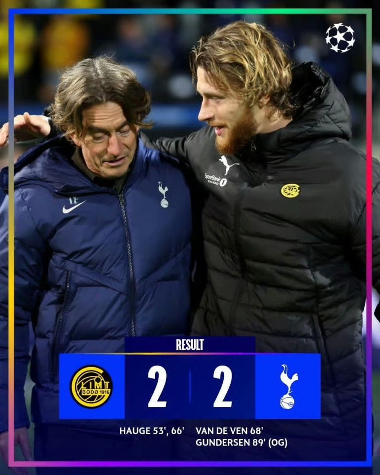 托特纳姆热刺则需要前去北极圈内迎战博德精通,即便错失了一次点球,博德精通照旧起先突破僵局的一方,海于格的梅开二度让博德精通无穷接近欧冠首胜,只不外热刺在随后沸腾了起来,范德芬头球破门后,热刺球员又制造了甘德森的乌龙,热刺重荷地从挪威带走一分。