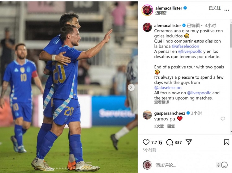 麦卡利斯特社媒晒出比赛像片,并写谈:“以两粒进球法例了积极的海外比赛日之旅,与国度队伙伴们共度数日时光老是令东谈主感到惬心。”