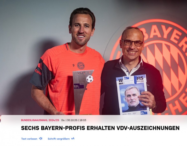 在VDV赛季最好球员评比中,两位拜仁球员踏进三甲。哈里-凯恩(20.0%)与迈克尔-奥利塞(17.0%)仅逊于卫冕冠军弗洛里安-维尔茨(29.1%)。