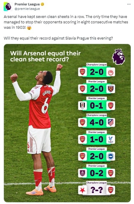 英超官方推特写谈:“阿森纳照旧集结7场比赛保执了零封,他们上一次集结8场零封敌手还要追想到1903年。”