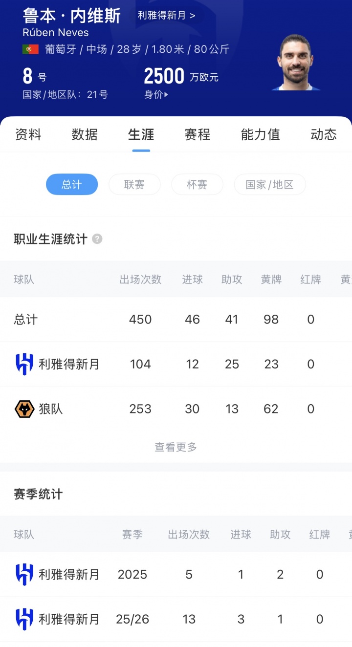 内维斯在2023年的夏窗以5500万欧的转会费从狼队加盟利雅得眉月,他当今的协议在2026年6月30日到期,球员当今身价2500万欧,本赛季他代表球队出战18场比赛孝顺4球3助,是球队的进犯球员。