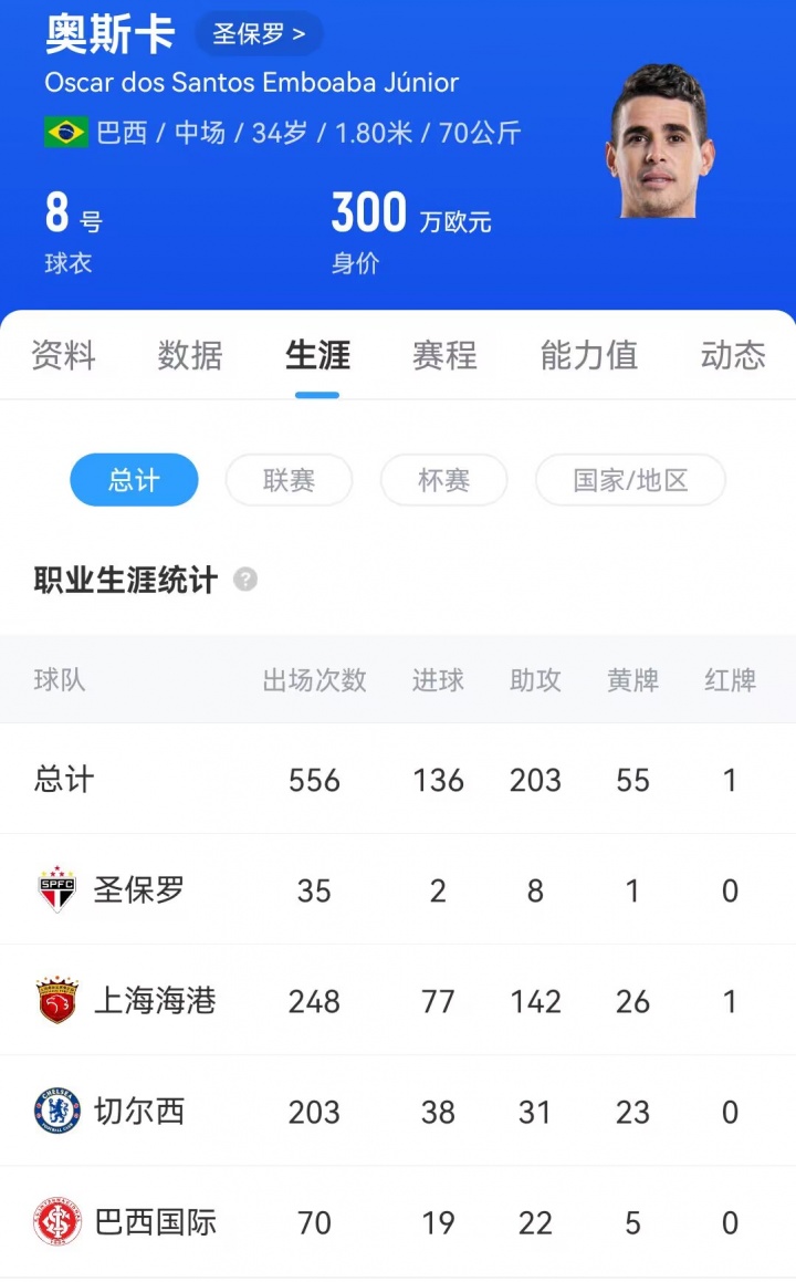 34岁的奥斯卡做事生计曾遵循巴西海外、切尔西、上海海港、圣保罗,上赛季中超截止后他摆脱身回到巴西,加盟圣保罗。