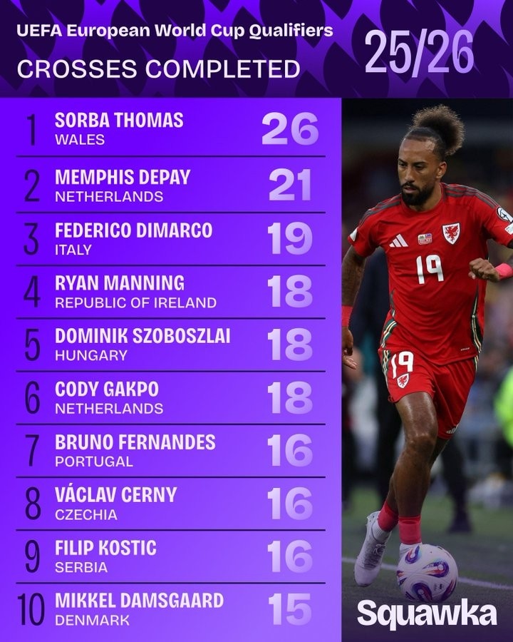 11月20日讯 本届世欧预小组赛一经告一段落,squakwa也统计了本届赛事奏凯传中情况,威尔士边锋索尔巴·托马斯领跑。