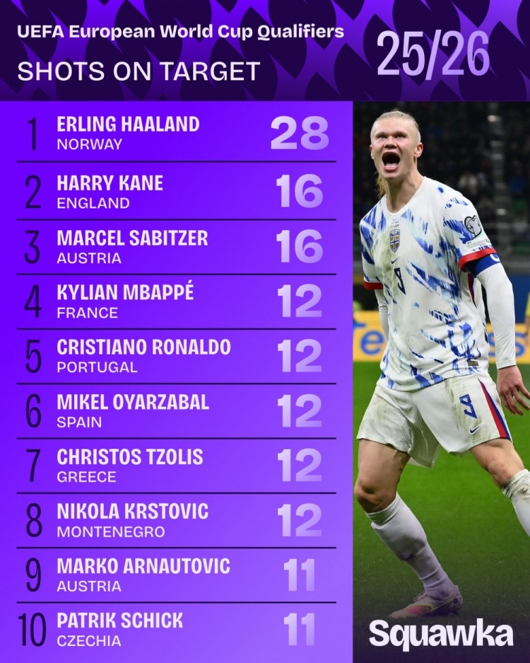 11月20日讯 本届世欧预小组赛也曾告一段落,squakwa也统计了本届赛事射正情况,哈兰德断崖领跑。