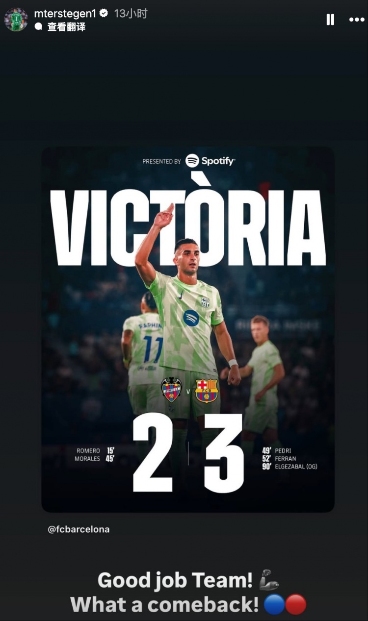 特尔施特根社媒写说念:干得漂亮!队友们🦾确凿一场精彩的大逆转💙❤️