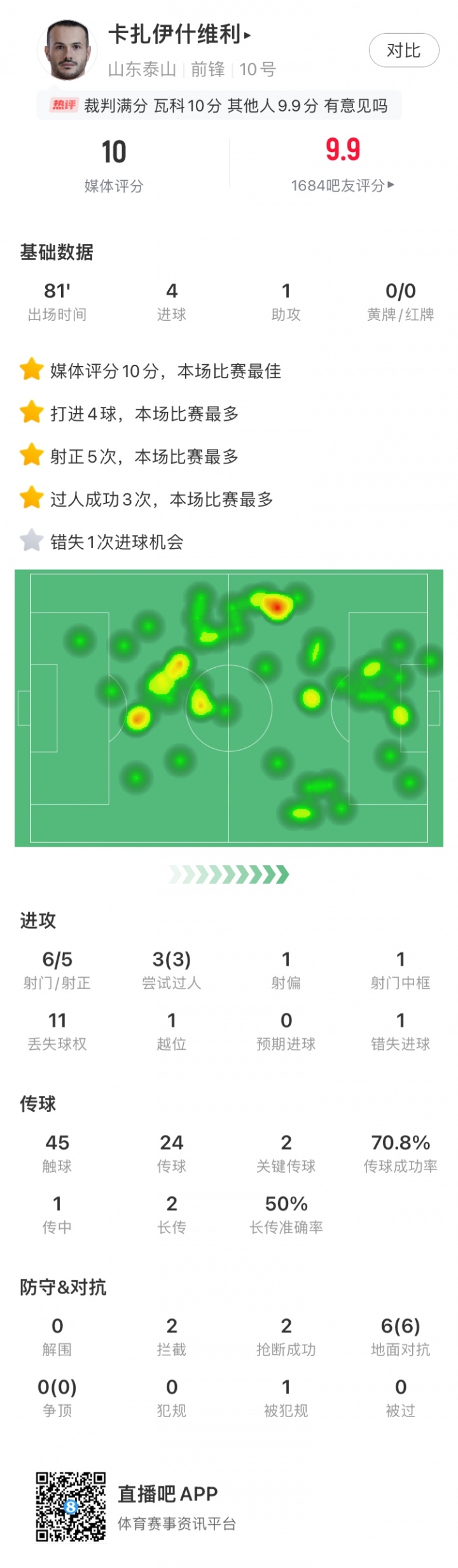 本期提名球员仅有1位——卡扎伊什维利!他濒临泰山夙敌国安,打进4球+1次助攻,奉献完满发挥!