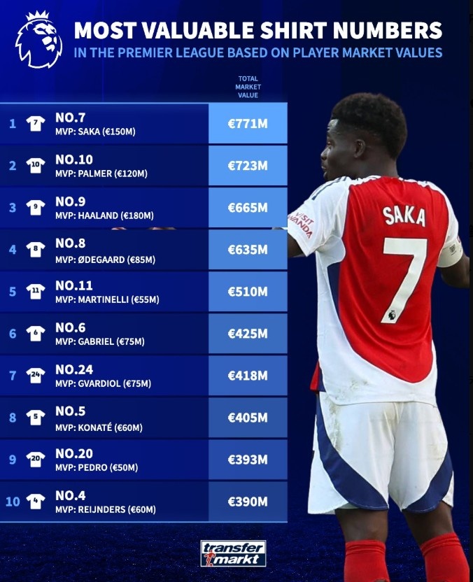 9月9日讯 德国转会市集对英超球星球衣号码的市集价值进行名次,其中身披7号球衣的萨卡总市集价值达到7.71亿欧元居首。
