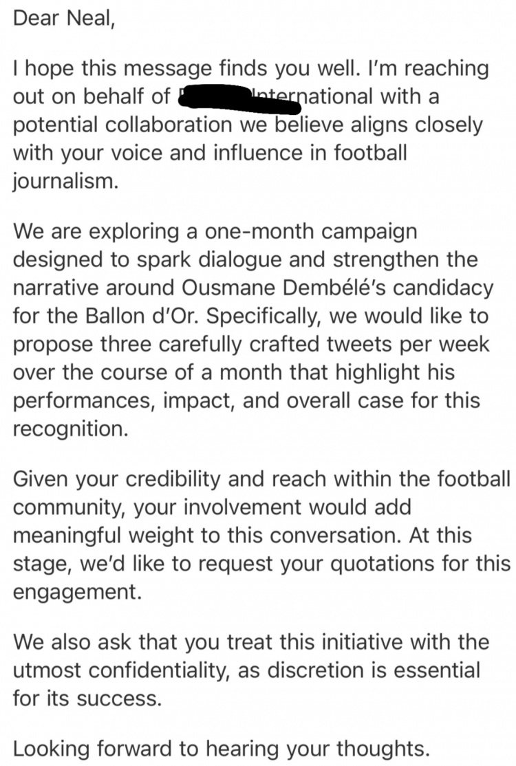 Neal社媒晒出公关公司的信函,并配文:“我最近被一家公关公司联系,对方但愿我作念一个有偿宣传步履,为登贝莱竞争金球奖造势。我不知谈资方是谁,但我合计这件事太造作了,是以必须把它说出来让各人知谈。”