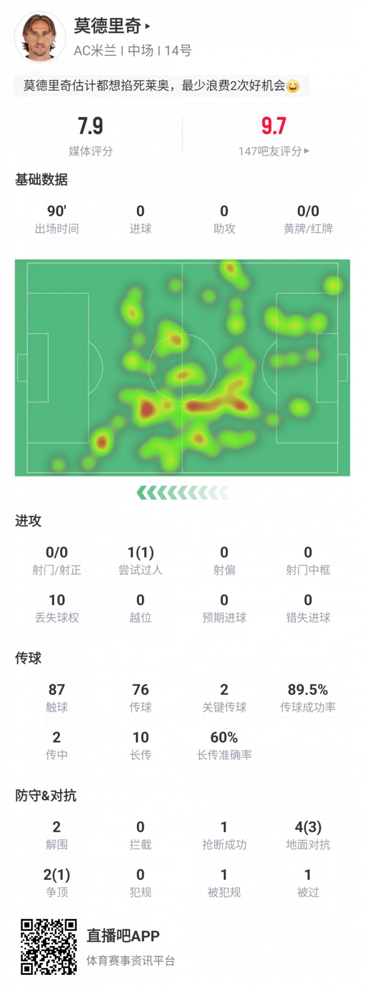 10月6日讯 米兰客场0-0战平尤文,莫德里奇为米兰首发出场,以下是他的个东说念主数据