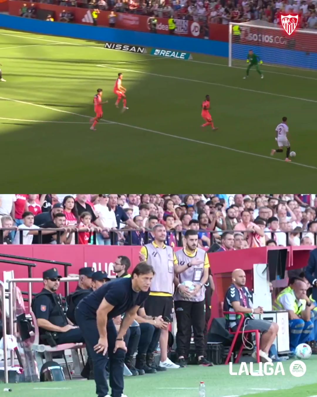 塞维利亚官方更新社媒动态,晒出卡尔莫纳攻入塞维利亚本场比赛第三球时场边的反馈,球队主帅阿尔梅达振臂庆祝,并与助攻卡尔莫纳的阿古姆拥抱。