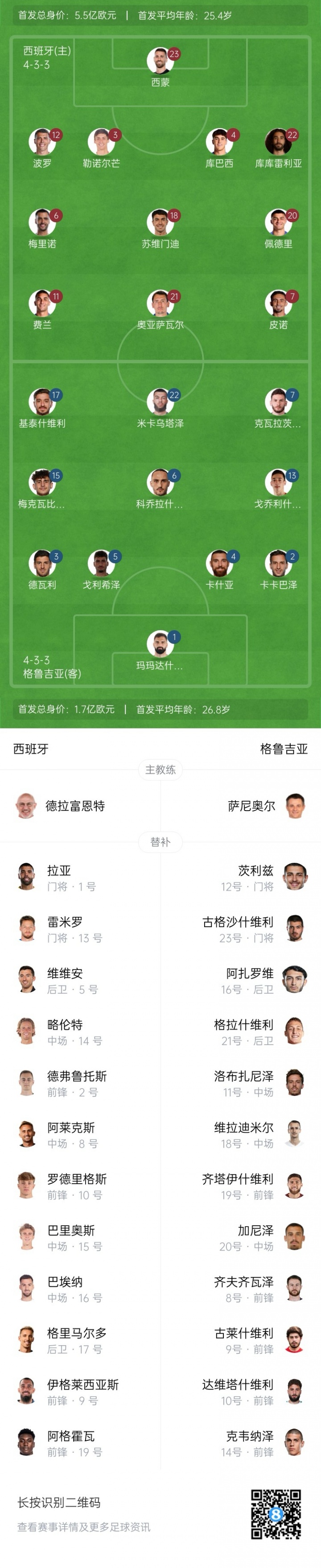 10月12日讯 世初赛欧洲区小组赛E组第3轮,西班牙对阵格鲁吉亚,赛前首发公布。