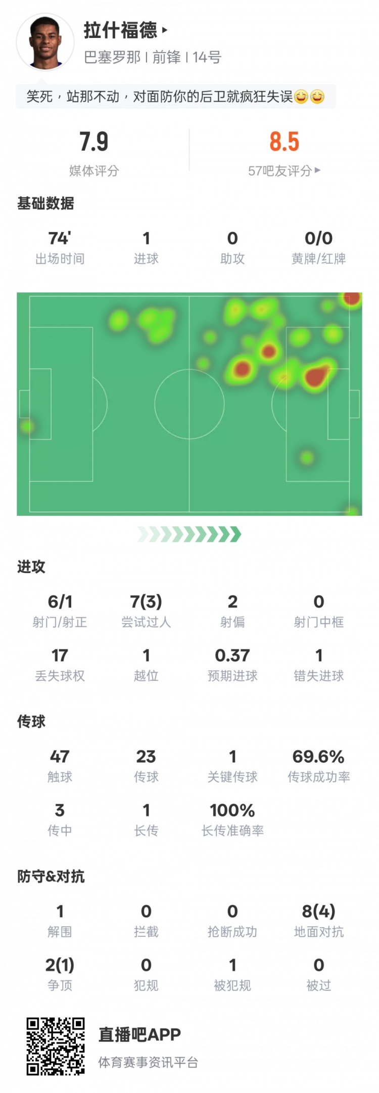 11月3日讯 西甲第11轮,巴萨主场迎战埃尔切。拉什福德首发出战,孝敬1粒进球,送出1次要道传球,3次过东说念主生效,但也错失1次进球契机,评分7.9。