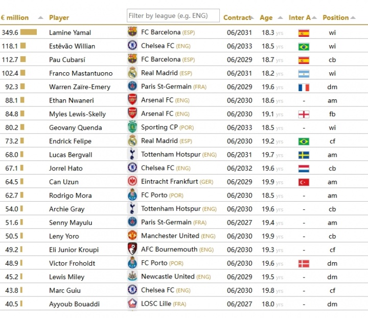 11月05日讯 本日,足球泰斗统计机构CIES统计了尚未年满20岁但预估转会费最高的球员,其中四位球员的预估转会费高出1亿欧元(含附加条目,且为100%扫数权)。亚马尔3.5亿欧,断层最初!