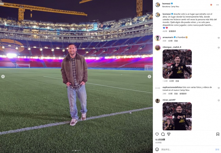梅西写说念:昨晚我重归一处我魂牵梦萦的场地。阿谁曾让我无比幸福的场地,你们让我大皆次成为世上最幸福的东说念主。希望有天我能归来,不啻所以球员身份作别——就像我长久未能完成的那样……💙❤️
