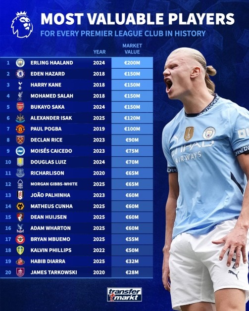 11月12日讯 德国转会市集盘货了英超各队历史身价最高球员,哈兰德以2亿欧居首,阿扎尔、凯恩、萨拉赫和萨卡均为1.5亿欧。