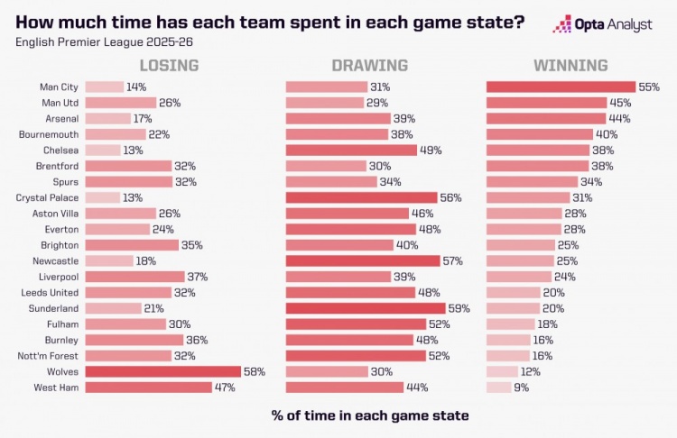 11月12日讯 本赛季英超仍是截至了11轮的争夺,OPTA统计了各队处在跨越、过期以及均势期间占比情况,其中曼城平均每场比赛跨越期间最长,达到总比赛期间的55%,而水晶宫和切尔西平均每场处在过期情况下的比赛期间最短,仅为总比赛期间的13%。